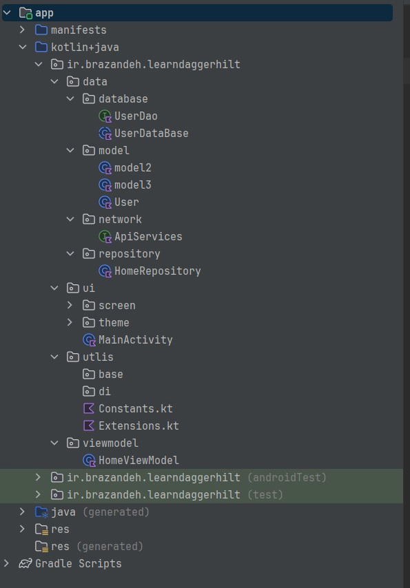 • اگه به این پوشه دقت کنید ، فایل های مانند base , di , constants , Extension این ها هیچ کدام مربوط به UI – data – Viewmodel نیستند اما برای پروژه لازم هستند مانند پوشه di که مخفف Dependency Injection یا تزریق وابستگی هست در این قسمت Utils قرار میگیرد