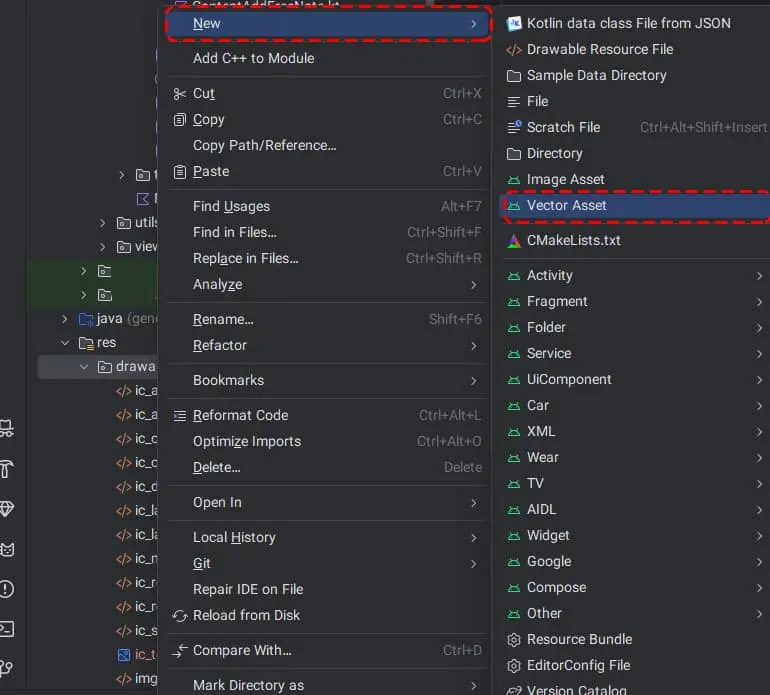 - کپی و جایگذاری: فایل SVG مورد نظر خود را مستقیماً در پوشه res/drawable کپی کنید.(اما این روش رو پیشنهاد نمیکنم ، بهتر از روش زیر استفاده کنیم )