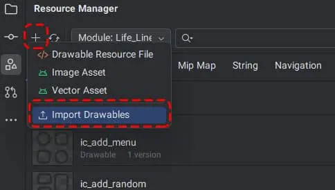 بعد از این جا گزینه + کلیک کنید و گزینه ای import drwable رو بزنید